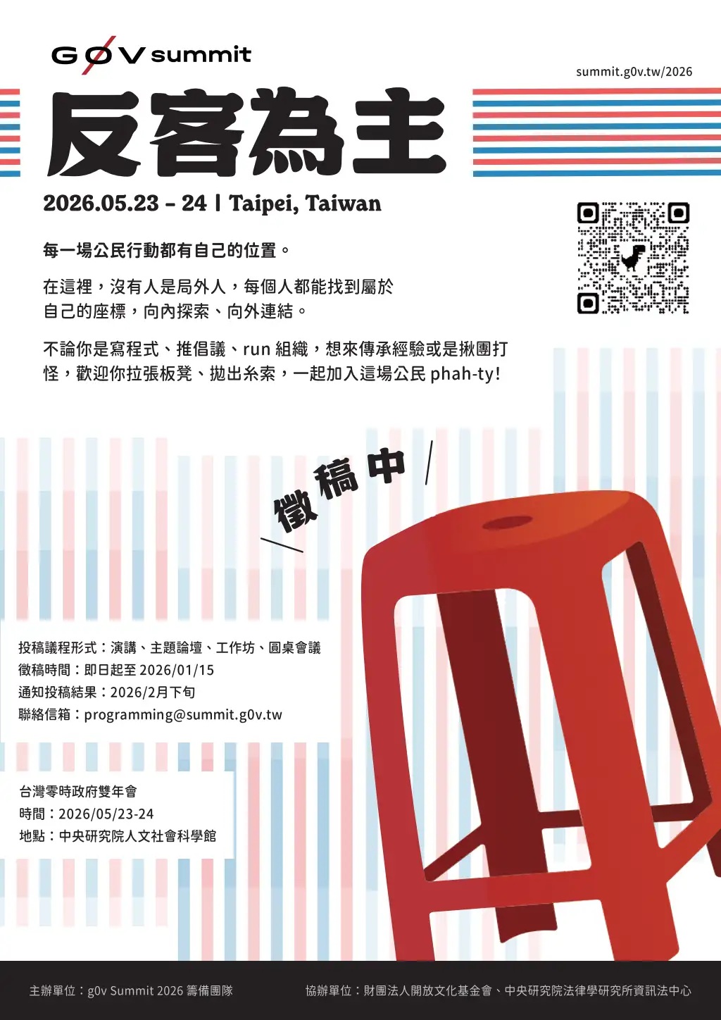 投稿及報名相關資訊,請至活動官網:https://summit.g0v.tw/2026/查詢,或逕洽籌備信箱: coordinator@summit.g0v.tw。