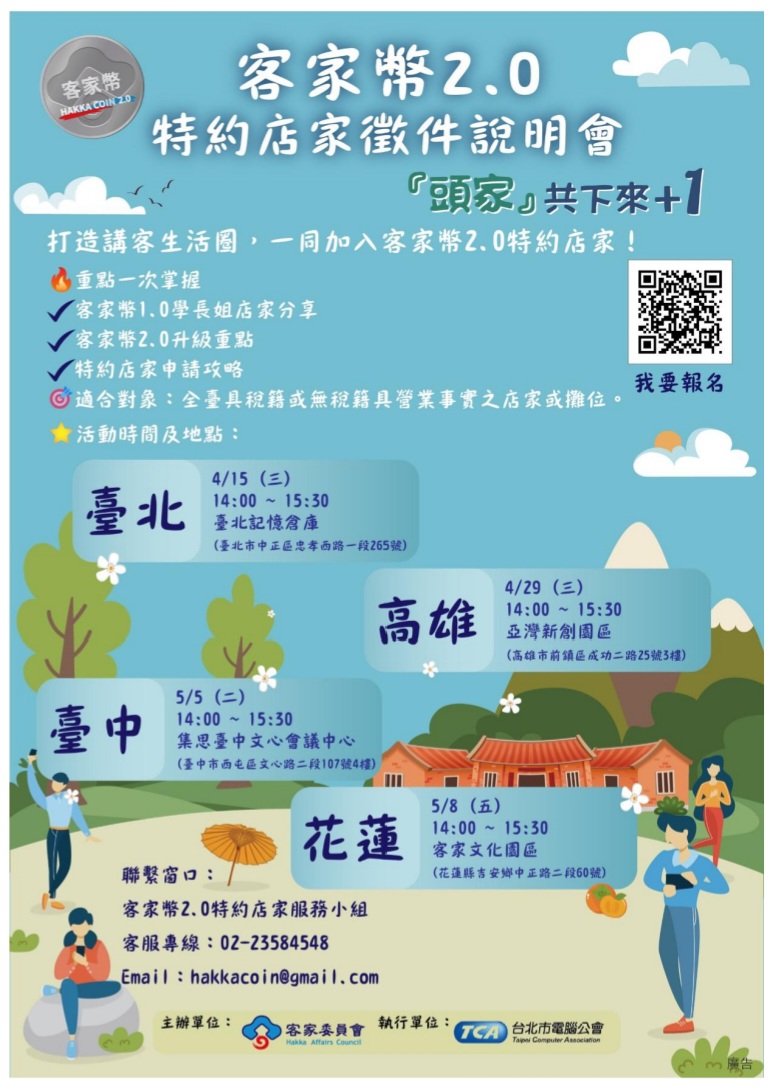 為鼓勵全國店家或攤位使用客語服務,攜手建構客語友善環境,將透過公開甄選,輔以培訓、現地評核,嚴選全臺客家幣2.0特約店家,共同打造講客消費生活圈。為使店家或攤位瞭解客家幣2.0政策、店家申請方式及TWQR功能介紹,爰辦理旨揭說明會。